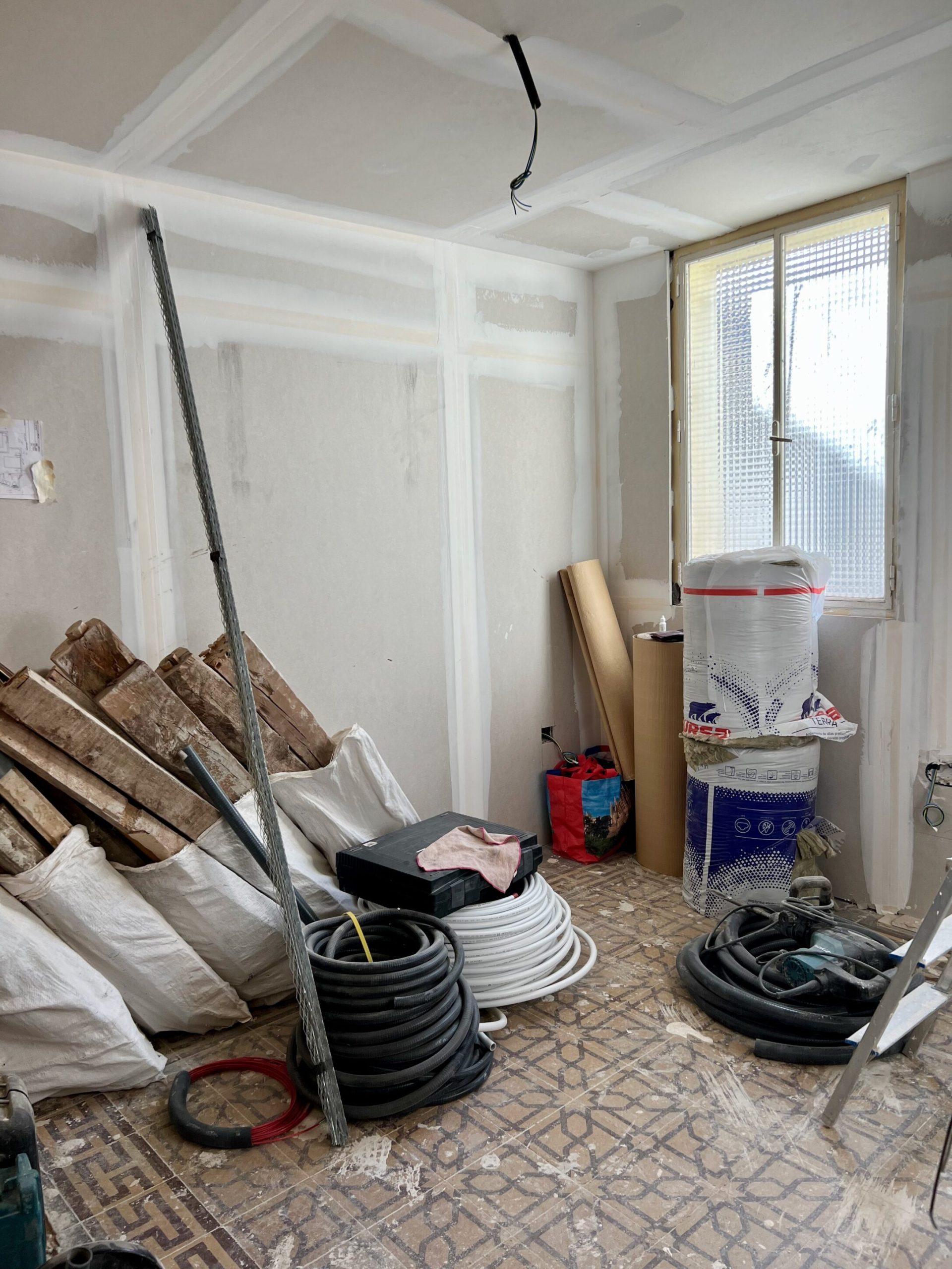 Para garantizar un adecuado aislamiento interior, se aplicaron soluciones específicas para reducir la transmisión acústica con las viviendas colindantes, acompañadas de nuevos sistemas de tabiquería en pladur para materializar la distribución propuesta.