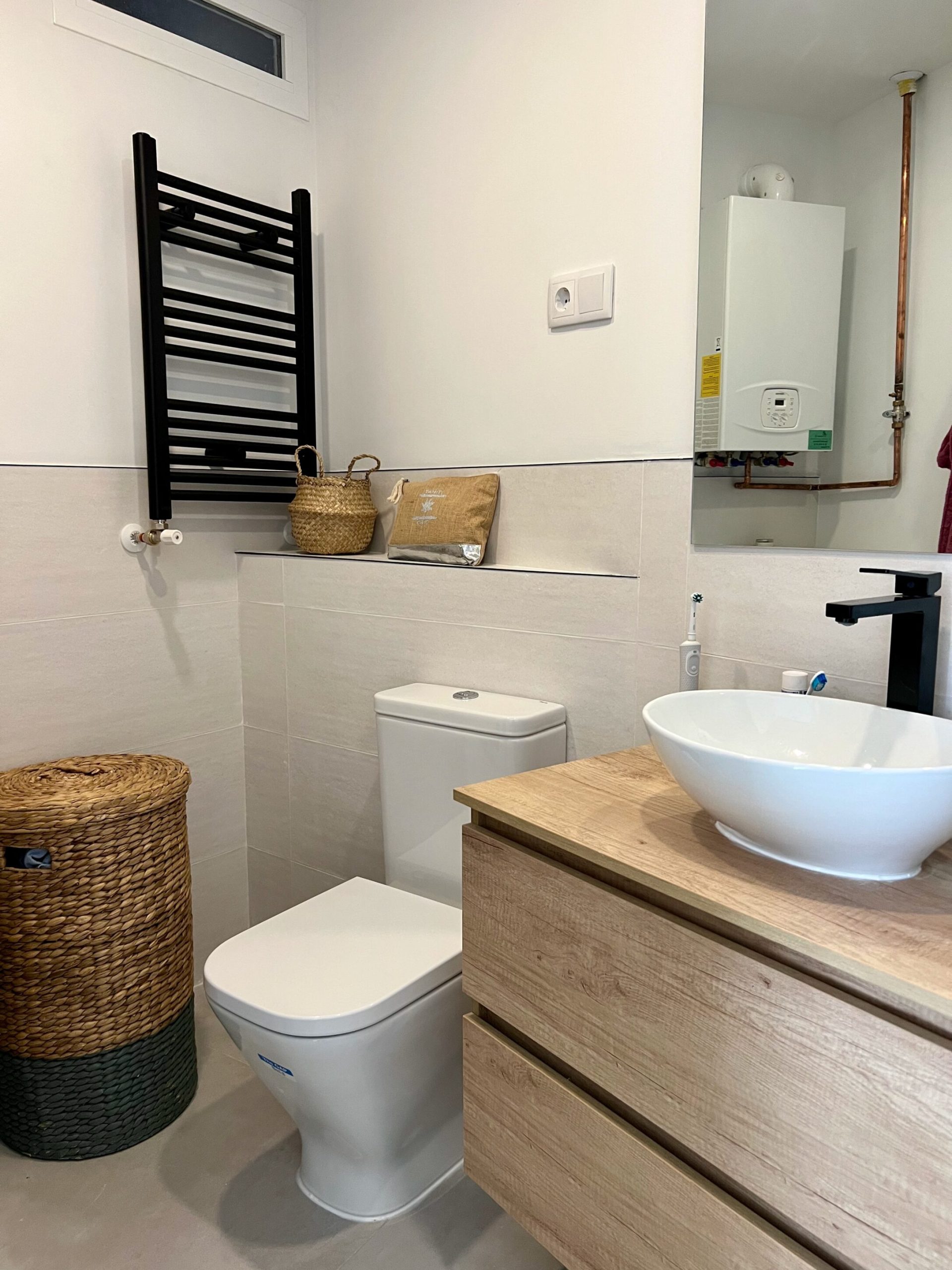 La ejecución de la reforma contempló la renovación total de las instalaciones, incluyendo calefacción por suelo radiante, electricidad, fontanería y telecomunicaciones, todas ellas dimensionadas según normativa actual. También se implementó un moderno sistema de aerotermia para alimentar el suelo radiante y el agua caliente sanitaria, aportando máxima eficiencia energética y confort.