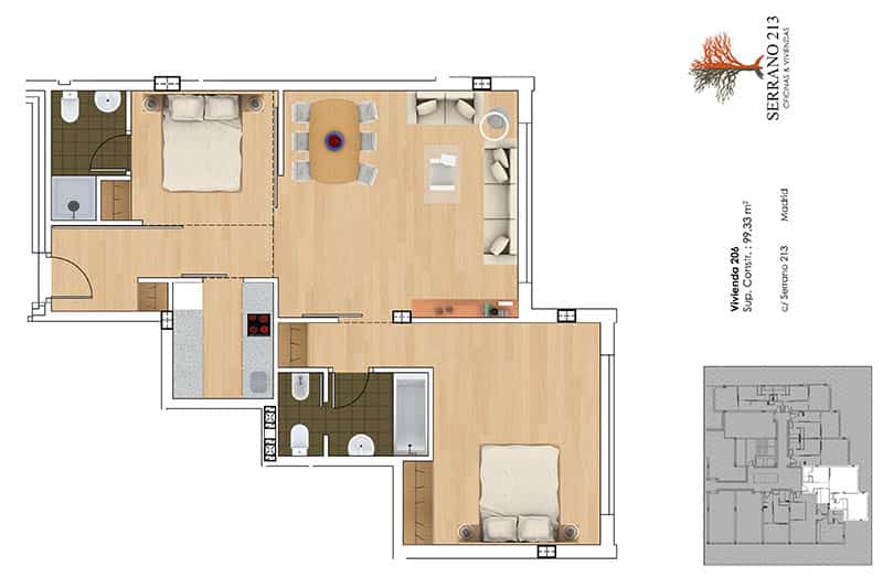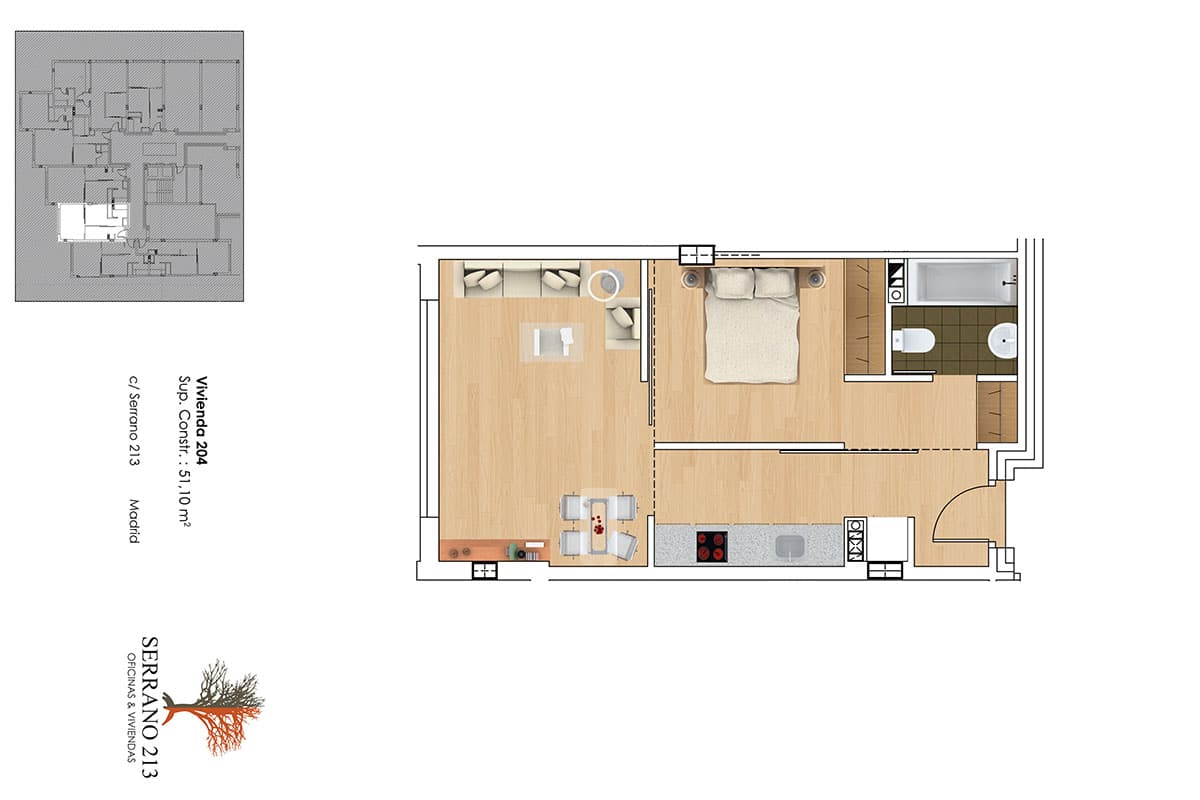 En 2007, se decidió renovar la planta primera y la mitad de la planta segunda del edificio Serrano 213. Un grupo de inversionistas adquirieron un espacio diáfano de 1·094 m2 distribuidos en esas dos plantas· Este proyecto completo incluyó la rehabilitación total del espacio, creando 11 oficinas diáfanas e integrables en la primera planta y 7 viviendas contemporáneas en la segunda planta, con dos de 2 dormitorios y cinco de 1 dormitorio, cada una amueblada y equipada para alquiler temporal durante la crisis económica·